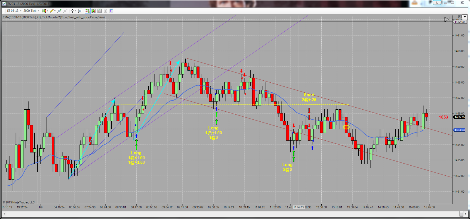 I took the blue line trend from the two swing highs of the day and copied to the lower channel. This channel was too wide. I need to find out how to come up with a better system for my trailing stop. It seems I usually get stopped out at BE if I just leave it there when I could have at least gotten 2-4 more ticks by moving it up before it eventually came back to the BE. Today I tried keeping it 2 ticks under the previous bars close. It seems I get more profits in smaller trades but that you miss the big runs when they happen.